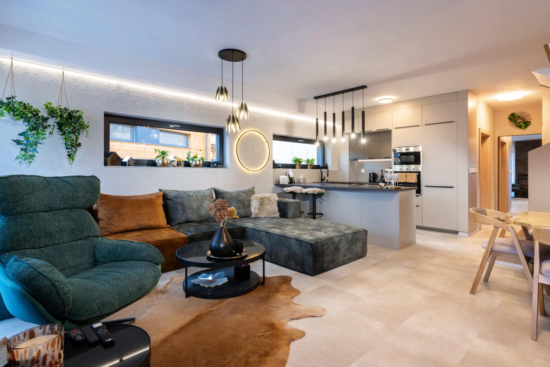 obývací část s 5× Smart TV (Netflix, Disney+, Voyo, O2 TV aj.)